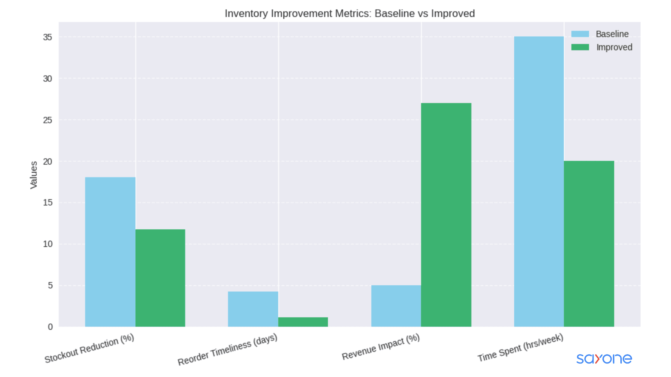 The stockout incidents reduced by 35% as proactive alerts gave 3-7 days lead time for reordering.